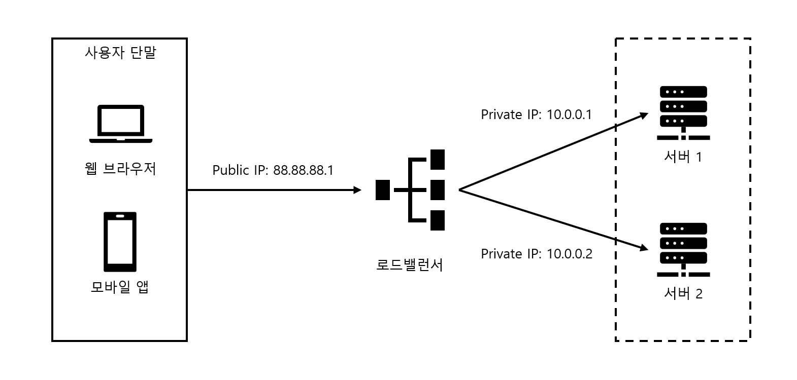 보안을 위해 서버 간 통신에는 private IP 주소를 사용한다. Private IP는 같은 네트워크에 속한 서버 사이의 통신에만 사용되는 IP 주소로, 인터넷을 통해 접속할 수 없다. 로드밸런서는 웹 서버와 private IP 주소로 통신한다.