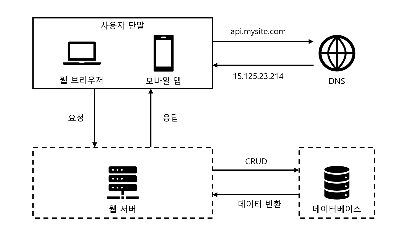 DNS에서 도메인 이름에 해당하는 IP 주소를 주고 이 IP 주소로 HTTP 요청을 보내면 서버는 HTML 페이지 또는 JSON 형태의 데이터를 응답으로 반환한다.