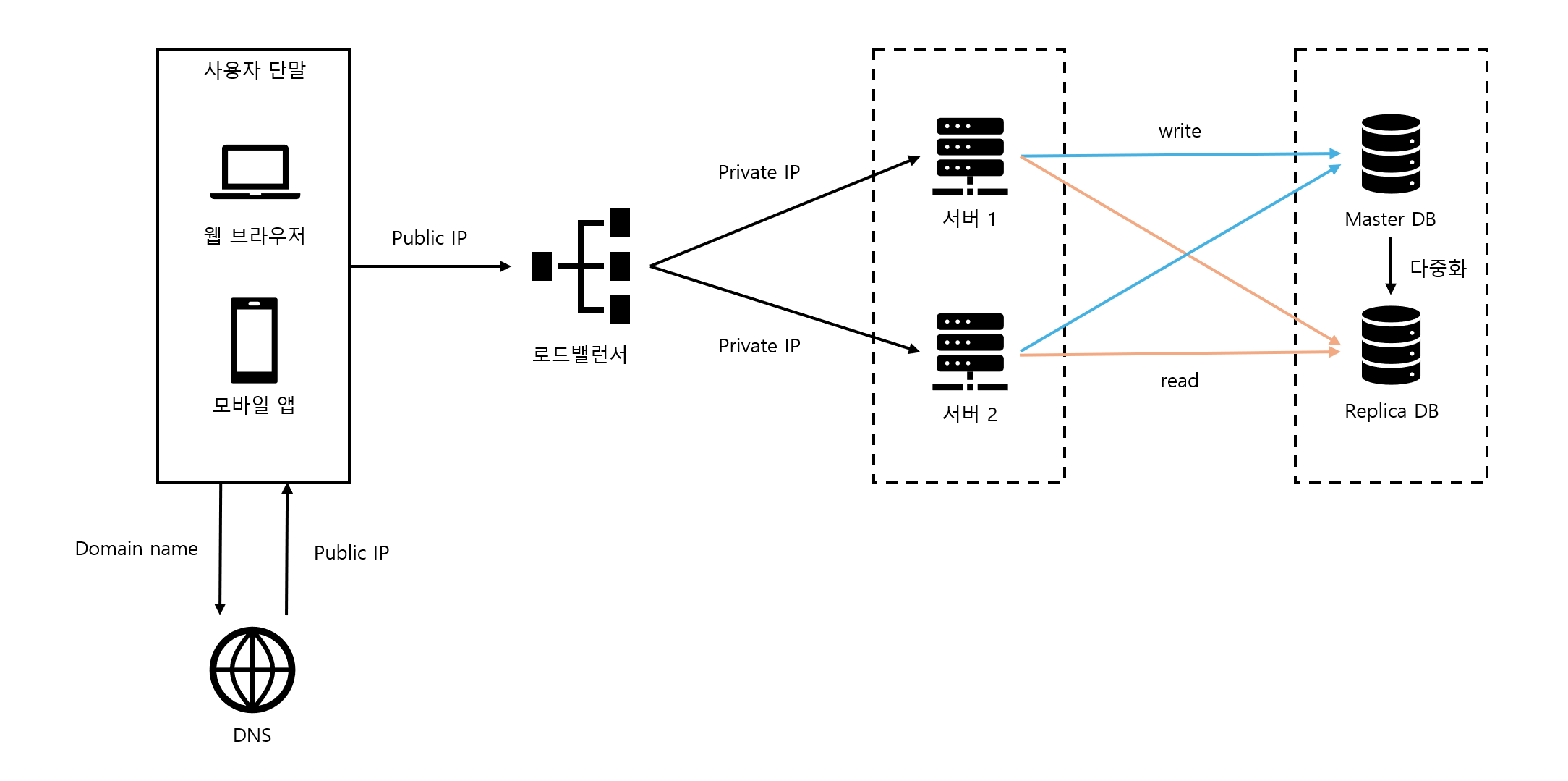 사용자는 로드밸런서의 public IP 주소로 접속한다. 따라서 웹 서버는 사용자의 접속을 직접 처리하지 않는다.