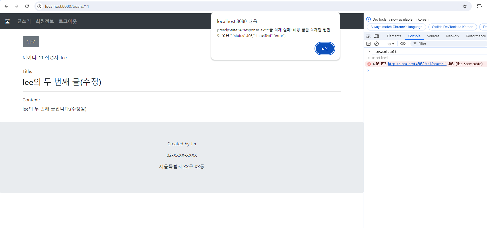 상세 페이지가 로드될 때 board.js가 같이 로드되는데, 로드된 board.js의 함수를 보고 콘솔에서 호출하면 다른 사람의 글도 삭제할 수가 있다는 것이다.