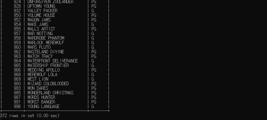 다음 쿼리는 등급이 'G' 또는 'PG'인 영화를 조회한다.