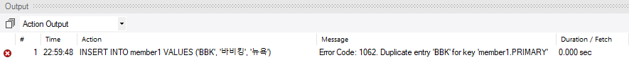 PK 중복 오류를 발생시키는 첫번째 문장은 그냥 넘어가고 두번째 문장부터는 정상적으로 값이 입력되었다.