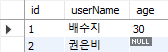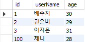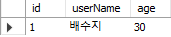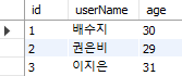 INSERT INTO test(id, userName, age) VALUES (1, '배수지', 30);