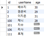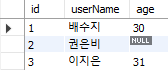 INSERT INTO test2 VALUES (NULL, '배수지', 30);