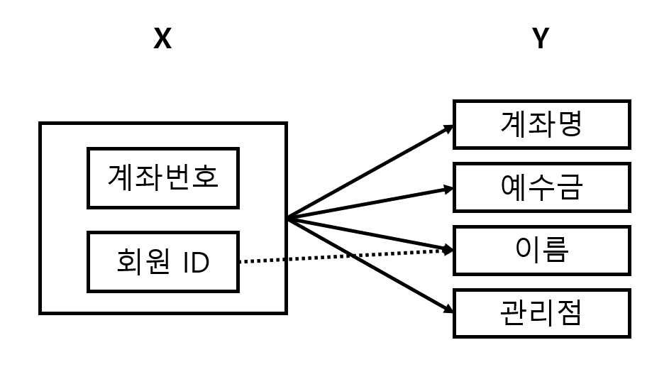 X→Y이면 Y는 X에 함수적으로 종속되어 있다.